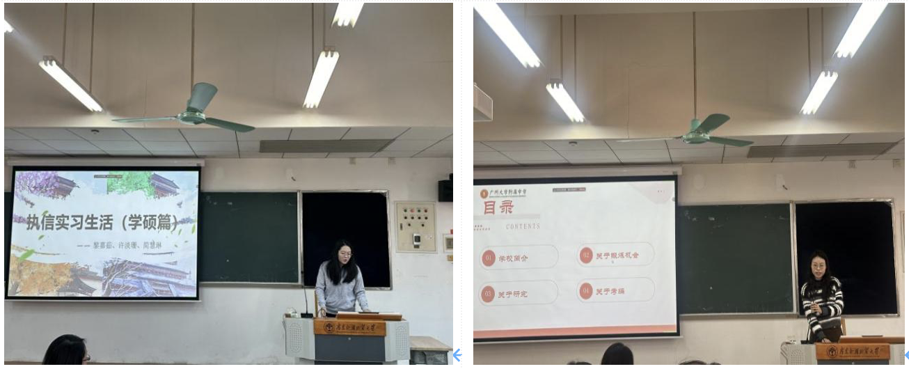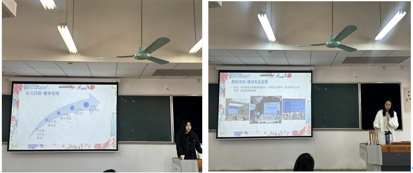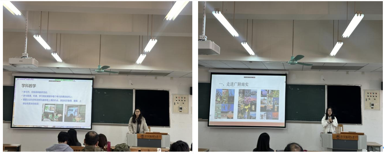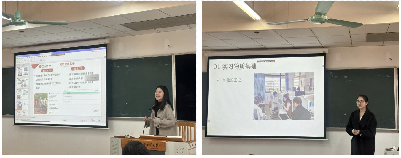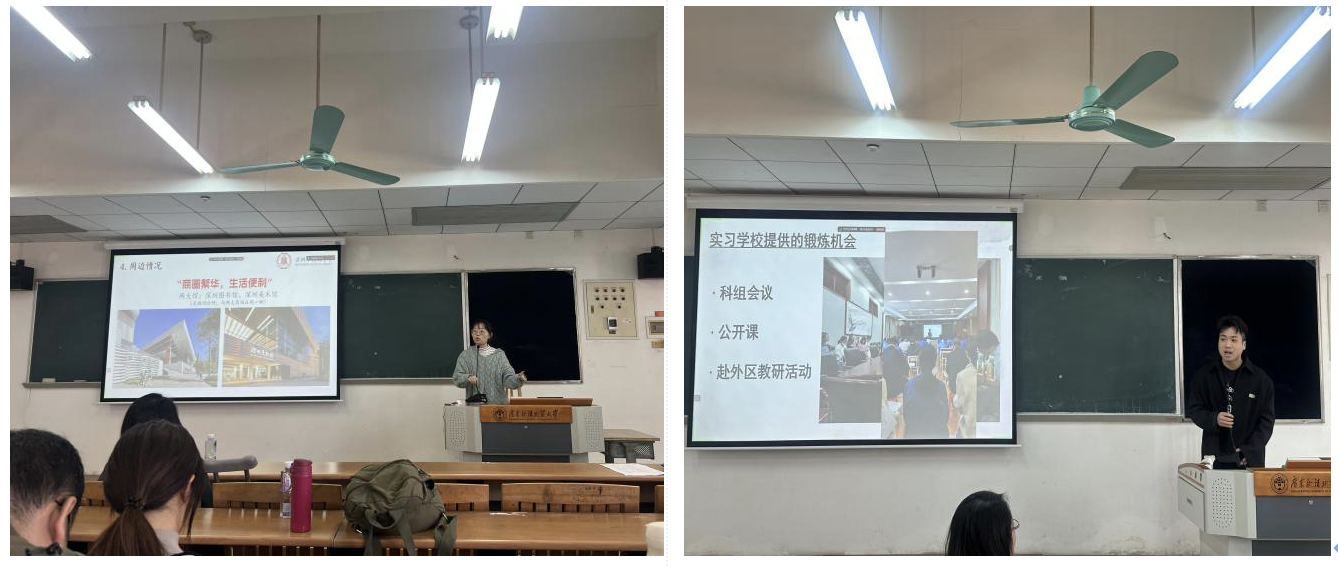 在研究生教育实习汇报阶段,许淡珊和朱梦蝶同学作为实习团队代表,汇报了在广州大学附属中学(大学城)和执信中学的实习情况。她们从实习学校独特的教育特色、创新的教学方法、班主任跟岗的深刻体会、评课研学的宝贵收获,再到丰富多彩的学生活动等方面,全方位地展示了精彩充实的实习生活。