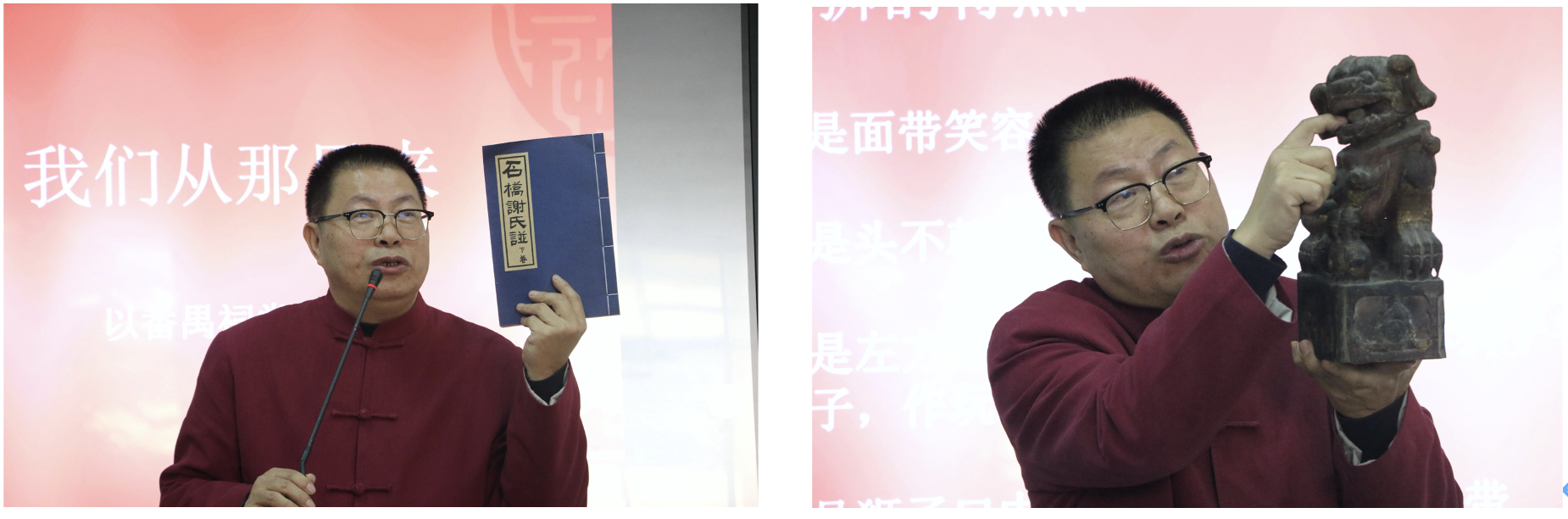 何穗鸿接着指出祠堂承载着人们对先辈的敬仰与对道德规范的坚守,是祭祀祖先、传承家风的重要场所。他通过展示一手图片资料和实物,从鳌鱼文化、笑狮文化、岭南文化核心价值中的积极心理学这三个方面,详细介绍了岭南祠堂的特点,生动地展示了祠堂建筑的精美构造与吉祥文化的丰富内涵。