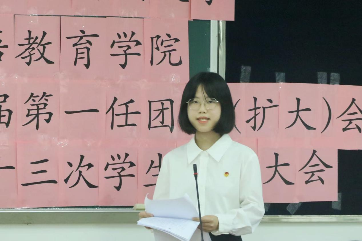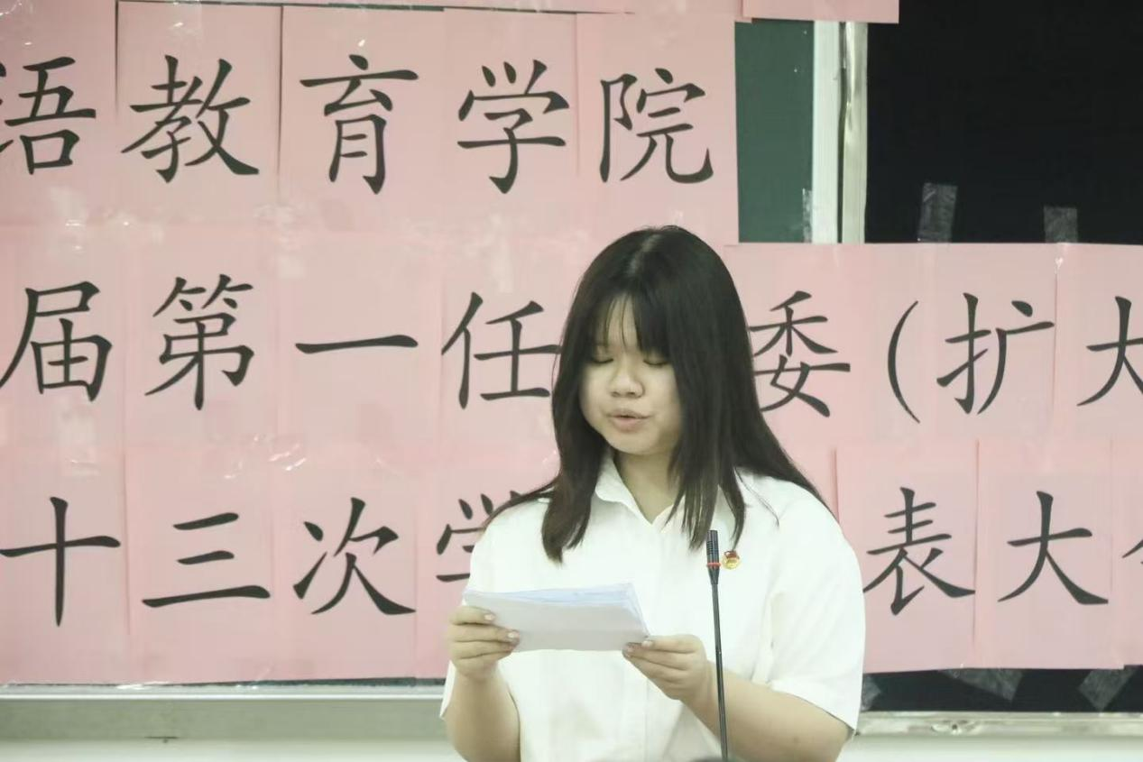 学生会执行主席郑晓潼在汇报第八届第一任团委、第十二届第一任学生会工作中指出,广东外语外贸大学英语教育学院团委学生会在校团委、校学生会指导与同学们的配合下,以“高效服务、思考创新”理念,围绕思想引领、社会实践等方面开展工作。她深度总结过往不足,并在工作能力、思想建设、团队协作、创新模式四个方面对下一届团委学生会提出新要求。