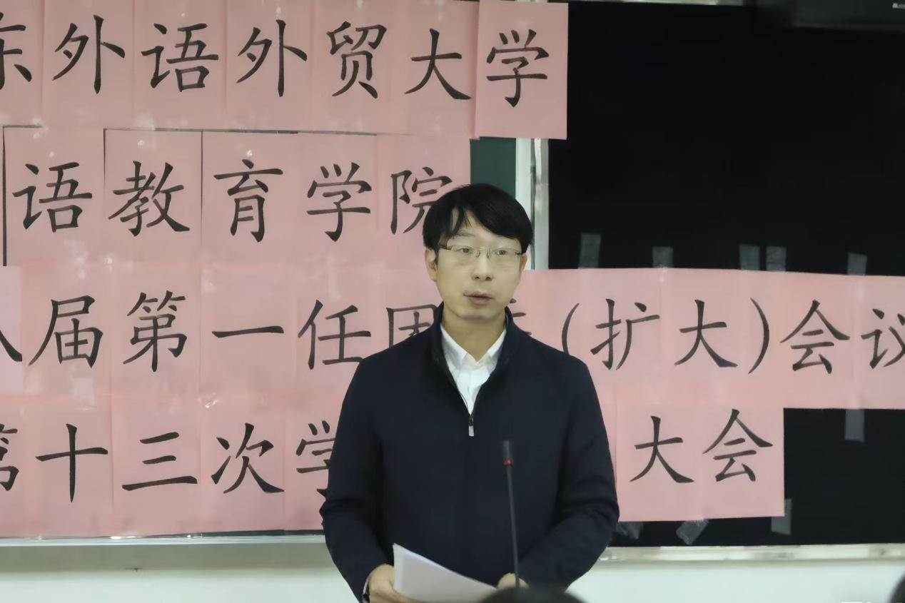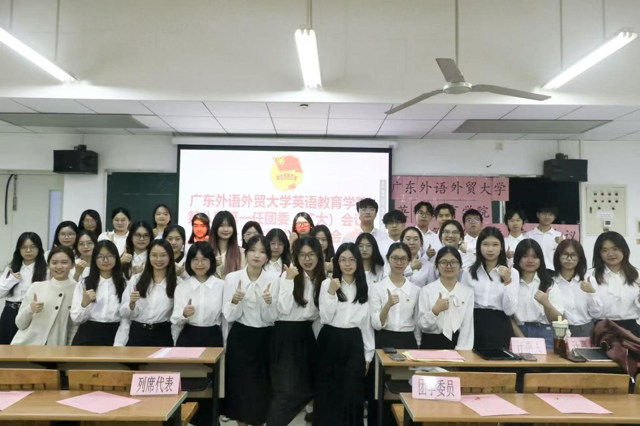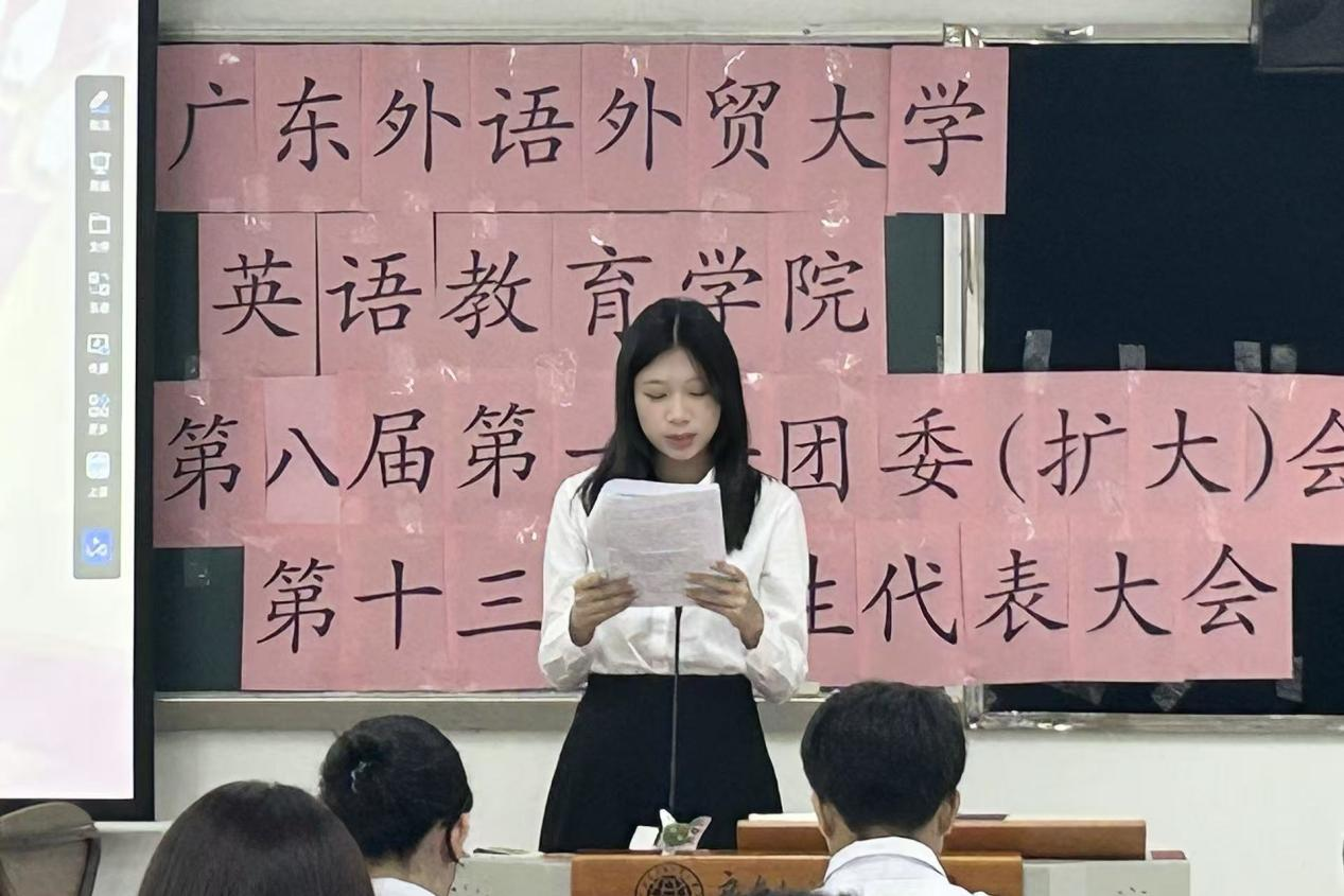 2025年10月23日晚七点,广东外语外贸大学英语教育学院第八届第一任团委(扩大)会议、第十三次学生代表大会议程在大学城校区教学楼E504召开。学院党委副书记罗诞铖,学院团委书记李敏嘉、团委副书记秦文静、学生会执行主席郑晓潼、第八届第一任团委委员、第十二届第一任学生会委员、各候选人以及各学生代表参会。